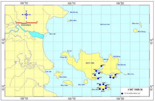 - Sinh cảnh phân bố xác định theo phương pháp đánh giá của Hodgson và Waddell [4] trên các vị trí khác nhau tại một số điểm thuộc Đầm Báy, Hòn Mun và Bích Đầm (Hình 1). Sử dụng phương pháp lặn quan sát theo mặt cắt với thiết bị lặn SCUBA, phạm vi khảo sát từ vùng triều đến độ sâu 20 m. Tại mỗi vị trí có hải sâm, các thông tin như nền đáy, độ sâu và một số thông số môi trường nước được tiến hành quan sát và ghi nhận.