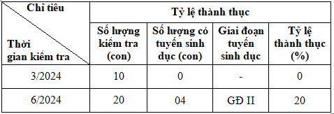 Qua giải phẫu kiểm tra lần 1 (tại thời điểm tháng 3/2024) tất cả Hải sâm đen đều chưa có tuyến sinh dục, kiểm tra lần 2 (tại thời điểm tháng 6/2024) phát hiện 04 cá thể có tuyến sinh dục đang phát triển ở giai đoạn II, với tỷ lệ được thể hiện qua Bảng 2 và Hình 7.