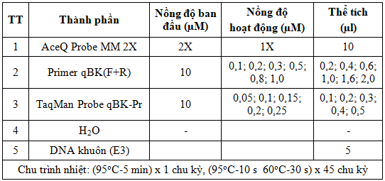 Trước khi so sánh hai master mix, đối với AceQ Probe MM, kỹ thuật real-time PCR xác định DNA-BKV cần được khảo sát lần lượt với nồng độ mồi và probe. Kết quả real-time PCR khảo sát nồng độ mồi và probe sử dụng AceQ Probe MM được tổng hợp ở Bảng 2.