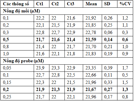 Chú thích: Ct: Chu kỳ ngưỡng; Mean: Trung bình; SD: Độ lệch chuẩn; CV: Hệ số biến thiên.