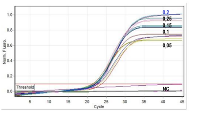 Hình 1. Đồ thị huỳnh quang khuếch đại gen VP1-BKV bằng phản ứng real-time PCR trên mẫu chứng dương E3 với các nồng độ probe 0,05; 0,1; 0,15; 0,2; 0,25 µM sử dụng AceQ Probe MM, NC: Đối chứng âm.