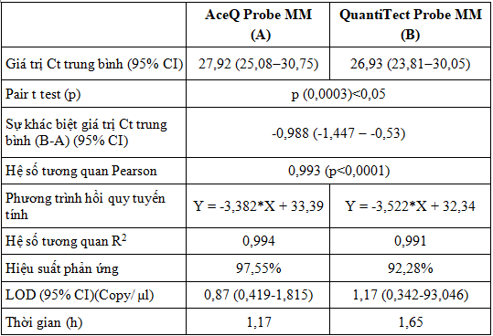 Về thời gian thực hiện phản ứng, kỹ thuật real-time PCR sử dụng AceQ Probe MM có thời gian phản ứng nhanh hơn QuantiTect Probe MM là 0,48 giờ (1,17< 1,65 giờ), giúp rút ngắn thời gian quá trình xét nghiệm.