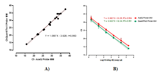 Hình 2. A) Mối tương quan giữa các giá trị Ct của hai master mix. B) Đường chuẩn cho hai master mix khi đánh giá trên mẫu chứng dương plasmid
