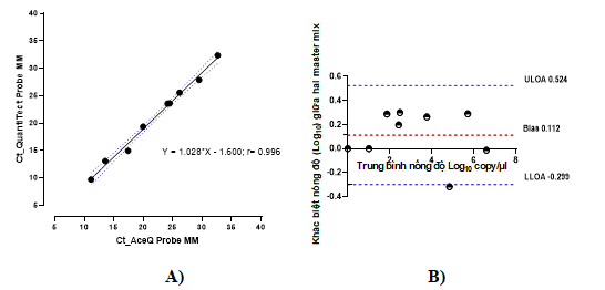 Để xác định liệu có sự khác biệt của giá trị nồng độ giữa hai master mix, chúng tôi đã đánh giá song song thông qua biểu đồ Bland-Altman. Khảo sát mức độ chênh lệch giá trị nồng độ (log10) của AceQ Probe MM và QuantiTect Probe MM, sự khác biệt trung bình (hiệu số của nồng độ C- AceQ Probe MM - C QuantiTect Probe MM) là 0,112. Kết quả cho thấy, không có điểm nào vượt ra ngoài giới hạn của sai biệt cho phép, tương đương 100% điểm nằm trong khoảng sai biệt ULOA và LLOA (-0,299; 0,524) (Hình 3B).