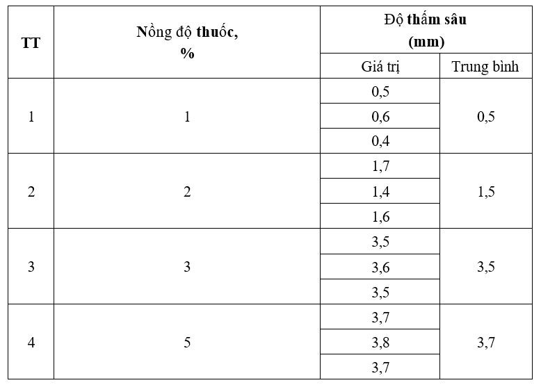 Kết quả trên cho thấy với nồng độ chế phẩm ngâm tẩm đạt 3% về khối lượng cho kết quả thấm sâu vào gỗ đạt hiệu quả cao, độ thấm sâu tăng gấp 3 lần so với nồng độ 1% và gấp 2 lần đối với nồng độ 2%. Với nồng độ chế phẩm 5% chỉ thấy sự tăng nhẹ độ thấm vào gỗ. Điều này có thể giải thích rằng, các thớ gỗ khi bão hòa về lượng thuốc sẽ bắt đầu quá trình liên kết các sợi xenlulo lại với nhau làm giảm dần sức thấm vào trong gỗ.