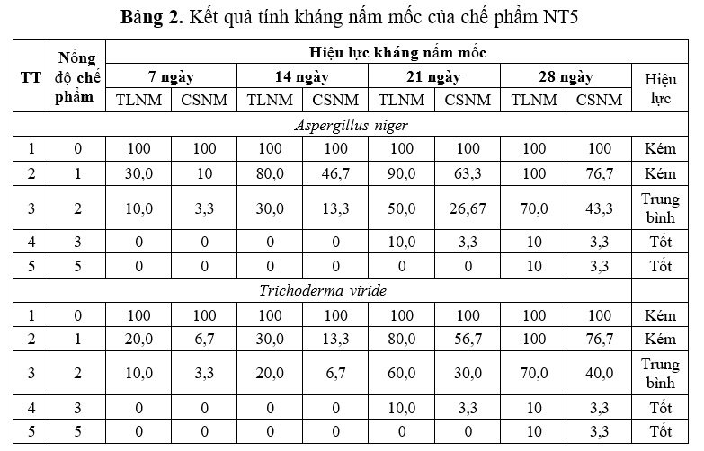 Sự xâm nhiễm và phân hủy gỗ hay các lâm sản của nấm mốc có mức độ nặng, nhẹ khác nhau, điều ấy phụ thuộc vào bản chất của từng loại nấm mốc và ở từng giai đoạn khác nhau cũng như cấu tạo của từng loại gỗ. Song tốc độ phân hủy còn phụ thuộc vào điều kiện sử dụng gỗ hay còn gọi là điều kiện môi trường. Ở điều kiện môi trường thuận lợi nấm sẽ phát triển tốt, ngược lại điều kiện bất lợi nấm sẽ phát triển chậm hoặc ngừng hẳn. Kết quả khảo nghiệm kháng nấm mốc của chế phẩm NT5 trong điều kiện lý tưởng với sự phát triển của nấm mốc được trình bày tại Bảng 2.