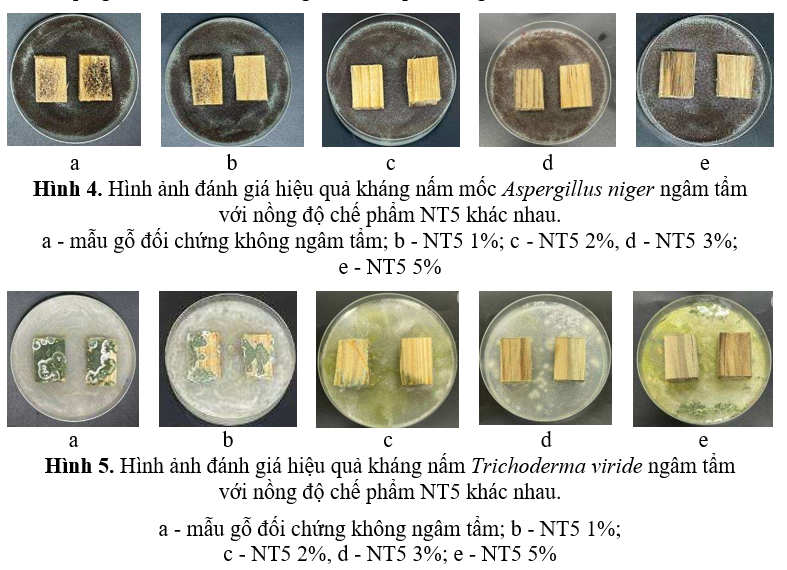 Kết quả thể hiện ở Bảng 2 cho thấy hiệu quả kháng nấm mốc rõ rệt của chế phẩm NT5 đối với chủng nấm mốc Aspergillus niger và Trichoderma viride. Ở nồng độ 1% đối với khoảng thời gian 7 ngày đầu cho kết quả kháng nấm trung bình, tuy vậy với thời gian tiếp theo trên 1 tuần diện tích nhiễm nấm mốc bắt đầu tăng dần, hiệu lực phòng chống giảm đi đáng kể và sau 4 tuần thì mất đi khả năng chống nấm. Với nồng độ chế phẩm ngâm tẩm trên 3% sau 4 tuần thử nghiệm quan sát thấy tác dụng rõ rệt ngăn ngừa sự phát triển của nấm mốc, hiệu quả bảo vệ đạt tốt. Điều này có thể được giải thích do trong quá trình xử lí gỗ bằng phương pháp ngâm thường, các hóa chất bảo quản len lỏi vào và lấp đầy các lỗ hổng trong cấu trúc của gỗ, tạo nên môi trường dinh dưỡng bất lợi cho nảy mầm hoặc có thể tiêu diệt bào tử nấm. Do đó ảnh hưởng đến sự ăn lan của sợi nấm vào bên trong các cấu trúc gỗ, ức chế sự sinh trưởng của nấm, nhờ đó nâng cao hiệu quả kháng nấm.