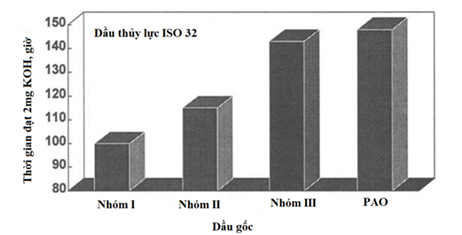 Hình 1 thể hiện độ bền chống oxy hóa theo ASTM D4871 ở 170oC của dầu thủy lực ISO 32 được làm từ các nhóm dầu gốc khác nhau [4]. Nghiên cứu cho thấy độ bền chống oxy hóa của dầu được pha chế từ dầu nhóm III và dầu PAO vượt trội so với dầu nhóm I, II, trong đó dầu nhóm III có giá thành hợp lý hơn cả.