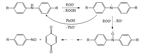 Nghiên cứu của Gatto V.J. và Grina M.A. [8] cho thấy, phụ gia chống oxy hóa đạt hiệu quả cao hơn khi sử dụng dưới dạng hỗn hợp các dẫn xuất của phenol và amin do tác dụng chống oxy hóa cộng hợp. Các dẫn xuất của phenol (PhOH) có chức năng chuyển đổi gốc amin N• trở lại thành chất chống oxy hóa aminic hoạt động -NH. Trong trường hợp không có dẫn xuất phenol, gốc amin được chuyển thành gốc nitroxyl NO•. Quá trình oxy hóa gốc nitroxyl tiếp tục dẫn đến các sản phẩm phụ phân hủy amin có trọng lượng phân tử thấp không hoạt động [9]. Do vậy cần lựa chọn phụ gia chống oxy hóa thích hợp để pha chế dầu có độ bền chống oxy hóa tốt, đạt chất lượng theo tiêu chuẩn.