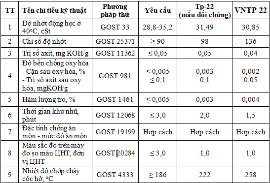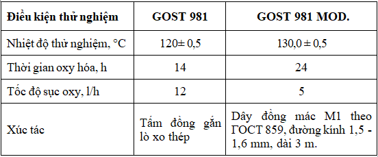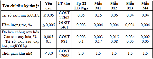 Đối với chỉ tiêu độ bền chống oxy hóa: Theo GOST 9972-2020, dầu tuabin Tp-22 có độ bền chống oxy hóa được tiến hành thử nghiệm theo tiêu chuẩn GOST 981 và GOST 18136. Bản chất của hai phương pháp là oxy hóa dầu trong thiết bị VTI (GOST 981) hoặc thiết bị đa năng (GOST 18136) dưới tác động của oxy ở nhiệt độ cao với sự có mặt của chất xúc tác, tuy nhiên đến thời điểm hiện tại không có đơn vị thử nghiệm nào tại Việt Nam có thiết bị và năng lực thực hiện được theo GOST 18136, vì vậy việc đánh giá độ bền chống oxy hóa của dầu chúng tôi tiến hành theo tiêu chuẩn GOST 981 với điều kiện quy định; đồng thời tiến hành thử nghiệm theo tiêu chuẩn GOST 981 với điều kiện quy định của tiêu chuẩn GOST 18136 (ký hiệu là GOST 981 MOD.). Điều kiện thử nghiệm được trình bày trong Bảng 1.