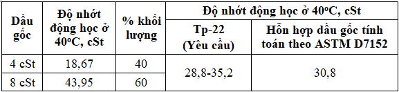 Hỗn hợp dầu gốc sau khi được pha trộn theo tỷ lệ 40% khối lượng dầu 4cSt và 60% khối lượng dầu 8 cSt được tiến hành kiểm tra một số chỉ tiêu kỹ thuật quy định theo GOST 9972-2020. Kết quả được trình bày tại Bảng 3.