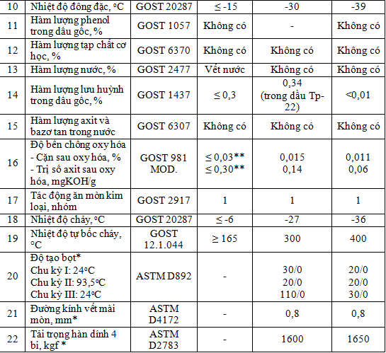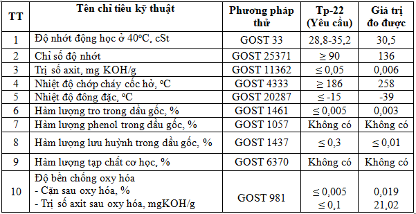 - Hỗn hợp dầu gốc đáp ứng các chỉ tiêu kỹ thuật đối với dầu gốc theo GOST 9972-2020. Ngoài ra, hầu hết các chỉ tiêu khác cho thấy hỗn hợp dầu gốc phù hợp để pha chế dầu tuabin tương đương với dầu Tp-22 của LB Nga