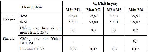 Để khảo sát ảnh hưởng của hàm lượng các phụ gia đến chỉ tiêu kỹ thuật của dầu pha chế, cụ thể là trị số axit, hàm lượng tro và độ bền chống oxy hóa, đã tiến hành pha chế 4 mẫu dầu có thành phần phụ gia khác nhau (hàm lượng phụ gia phá nhũ DL 32 được giữ ở mức 0,02%). Đơn pha chế của các mẫu dầu được trình bày trong Bảng 4.