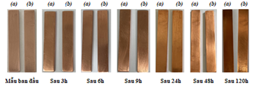 Sau 3 h thử nghiệm đối với các mẫu dầu đối chứng Tp-22 của LB Nga (a), mẫu nghiên cứu VNTP-22 (b), các tấm đồng xỉn màu nhẹ ở mức 1a, sau 24 h ở mức 1b, sau 120 h thử nghiệm, các mẫu dầu đều cho mức độ ăn mòn kim loại nhóm I. Mẫu dầu Tp-22 của LB Nga sau 120 h làm biến màu tấm đồng mạnh hơn (màu đậm hơn) so với mẫu VNTP-22. Như vậy, mẫu dầu pha chế VNTP-22 cho thấy đặc tính chống ăn mòn đồng tốt.
