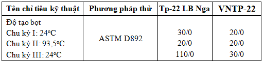 Kết quả trong Bảng 6 cho thấy, tuy không sử dụng phụ gia chống tạo bọt nhưng dầu pha chế có thể tích bọt sau khi thổi khí trong 5 phút ở 24oC (chu kỳ I) là 20 ml (so với dầu Tp-22 là 30 ml), sau khi để yên 10 phút cả hai loại dầu đều cho 0 ml bọt - phá bọt hoàn toàn, chu kỳ II, III cũng cho kết quả tốt so với mẫu đối chứng. Như vậy VNTP-22 có khả năng chống tạo bọt tốt ngay cả khi không sử dụng phụ gia chống tạo bọt.