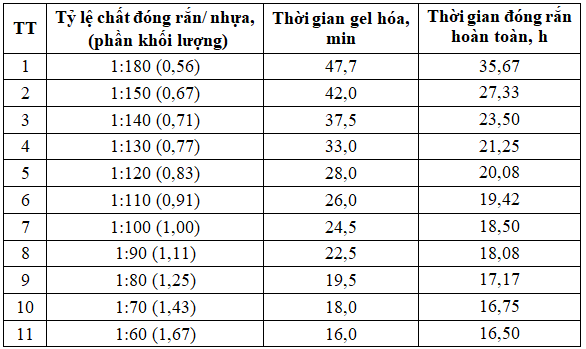 Bảng 1. Ảnh hưởng của tỷ lệ chất đóng rắn/nhựa lên thời gian gel hóa và thời gian đóng rắn hoàn toàn của composite