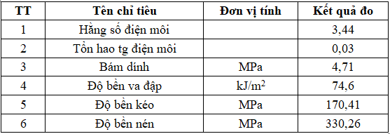 Hằng số điện môi và tổn hao tgδ ở tần số 106 Hz được xác định theo tiêu chuẩn ASTMD150-22; Độ bám dính được xác định theo tiêu chuẩn ASTM D4541-22, doly 20; Độ bền va đập được xác định theo tiêu chuẩn ISO 180:2003; Độ bền kéo được xác định theo tiêu chuẩn ASTM D638:22; Độ bền nén được xác định theo tiêu chuẩn TCVN 11993:2017; Thời gian đóng rắn hoàn toàn được thực hiện theo tiêu chuẩn TCVN 2096-5:2015 (ISO 9117-5:2012), theo phương pháp xác định thời gian khô cấp 3.