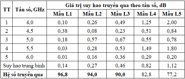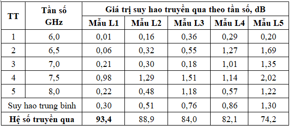 Kết quả đo độ truyền qua trên Bảng 4 cho thấy, ở dải tần (6÷8) GHz, chỉ có mẫu L1 cho độ truyền qua 93,4%, đảm bảo độ trong suốt điện từ, tương ứng với độ dày lớp phủ từ 1,25 mm (mẫu L1). Các mẫu có độ dày lớn hơn cho độ truyền qua nhỏ hơn 90%.