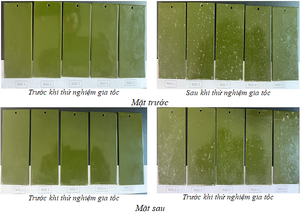 Thử nghiệm gia tốc để đánh giá độ bền lớp phủ composite trong suốt điện từ, so sánh đối chiếu với độ bền của hệ sơn trong suốt điện từ trên cơ sở sơn lót AK-070 và sơn phủ EP-140. Kết quả thử nghiệm cho thấy, sau 145 ngày (145 chu kỳ), 05 mẫu thử lớp sơn trong suốt điện từ bị phồng rộp bề mặt ở cả 2 mặt. Các mẫu lớp phủ composite trong suốt điện từ chưa xuất hiện hiện tượng bong tróc hay nứt vỡ. Hình ảnh các mẫu thử nghiệm được trình bày trong Hình 2 và Hình 3.