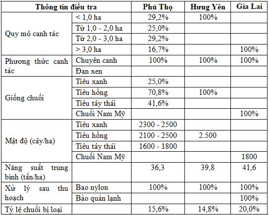 Bảng 1. Hiện trạng canh tác chuối ở các tỉnh Phú Thọ, Hưng Yên và Gia Lai