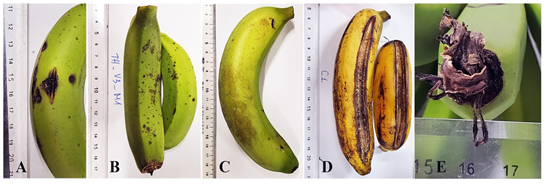 Hình 1. Các bệnh do vi sinh vật được ghi nhận trên hai giống chuối Tiêu hồng và Nam Mỹ tại các địa phương được điều tra: Bệnh thối quả (A); bệnh đốm quả (B, C); bệnh nứt vỏ (D); bệnh thối xì gà (E)