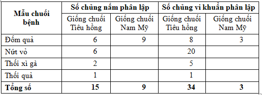 Từ 14 mẫu chuối bệnh thu thập tại các khu vực được điều tra đã phân lập được tổng số 24 chủng nấm và 37 chủng vi khuẩn. Số chủng nấm và vi khuẩn phân lập được từ mẫu bệnh đốm quả tương ứng là 6 và 8 chủng ở giống chuối Tiêu hồng, 9 và 3 chủng ở giống chuối Nam Mỹ. Trong khi đó, từ mẫu bệnh nứt vỏ của giống chuối Tiêu hồng, đã phân lập được 6 chủng nấm và 20 chủng vi khuẩn. Số lượng chủng nấm và vi khuẩn được phân lập từ các mẫu bệnh thối xì gà và bệnh thối quả thấp hơn rõ rệt so với mẫu bệnh đốm quả và bệnh nứt vỏ (Bảng 2).