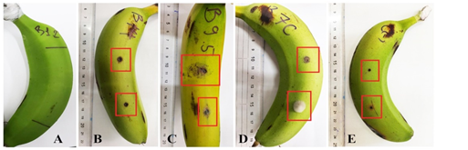 Hình 2. Lây nhiễm nhân tạo các chủng nấm trên quả chuối: Quả chuối chưa lây nhiễm (A); Các vết thương tổn sau 10 ngày lây nhiễm (B, C, D); Đối chứng (E)