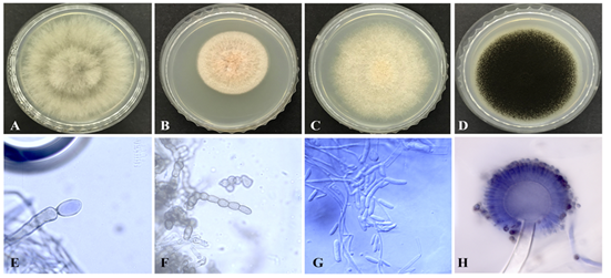 Hình 3. Hình thái khuẩn lạc và bào tử của 4 chủng nấm gây bệnh thối quả trên đĩa thạch PDA sau 7 ngày nuôi cấy ở 28oC, quan sát dưới kính hiển vi soi nổi (độ phóng đại 100×): Corynespora torulosa B2B (A, E); Microdochium colombiense B6 (B, F); Fusarium circinatum B13F (C, G); Aspergillus niger GL2.1 (D, H)