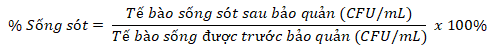 Tỉ lệ sống sót của mỗi chủng được xác định dựa trên cơ sở đánh giá mật độ vi sinh vật trước và sau đông khô theo phương pháp đếm số lượng đơn vị hình thành đơn vị khuẩn lạc (CFU) trên môi trường thạch GYP ở thời điểm 24 giờ sau khi xử lý lạnh sâu và sau đông khô mẫu. Kết quả được tính toán theo công thức [2, 15]: