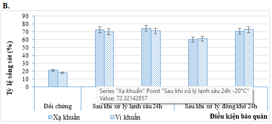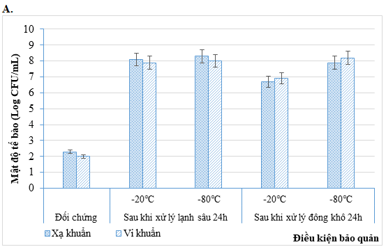Kết quả nghiên cứu thể hiện ở Hình 1.A và 1.B cho thấy ảnh hưởng của điều kiện xử lý lạnh sâu trước khi đông khô đến tỷ lệ sống sót của các vi sinh vật nghiên cứu. Cụ thể, khi các tế bào được xử lý lạnh sâu ở -80°C hoặc -20°C thì tỷ lệ sống sót sau quá trình đông khô của cả hai chủng đều cao hơn so với đối chứng mẫu không qua xử lý lạnh sâu, đạt 71% với xạ khuẩn, 73% với vi khuẩn khi xử lý lạnh sâu ở -80°C; và đạt 60% với xạ khuẩn, 61% với vi khuẩn khi xử lý lạnh sâu ở -20°C. Trong khi đó ở công thức không xử lý lạnh sâu, tỷ lệ sống sót chỉ đạt 20,5% với xạ khuẩn và 17,6% với vi khuẩn. Mật độ các chủng xạ khuẩn TA3.A03, vi khuẩn ĐL01.B09 sau khi xử lý lạnh sâu ở -80°C đạt 2,1 × 108 CFU/mL và 3,1 × 108 CFU/mL, trong khi mật độ các chủng này chỉ đạt 1,8× 106 - 2,9 × 106 CFU/mL khi xử lý lạnh sâu ở -20°C. Như vậy, xử lý lạnh sâu ở -80°C cho tỷ lệ sống sót của các chủng vi khuẩn và xạ khuẩn sau đông khô cao hơn so với xử lý lạnh sâu ở -20°C. Kết quả nghiên cứu tương tự cũng đã được Zhao và cộng sự (2005) công bố và xác định mẫu vi khuẩn Lactobacillus brevis được xử lý lạnh sâu ở -65°C có tỷ lệ sống sót sau đông khô đạt 65% cao hơn so với xử lý lạnh sâu ở -20°C (tỷ lệ sống sót đạt 46%) [4].