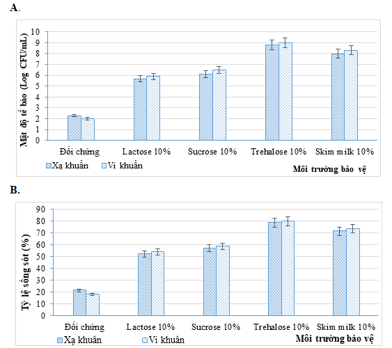 Tác động riêng rẽ của việc sử dụng lactose, sucrose, trehalose và skim milk (10%, w/v) như là chất bảo vệ đối với khả năng sống sót của chủng vi khuẩn và xạ khuẩn nghiên cứu so với đối chứng (chỉ sử dụng nước muối sinh lý khử trùng NaCl 0,9%) được đánh giá ở cùng điều kiện xử lý lạnh sâu -80°C trong 12h trước khi chuyển tiếp sang thiết bị đông khô. Kết quả thể hiện ở Hình 2.A và 2.B cho thấy, có sự khác biệt về khả năng tồn tại của các chủng vi khuẩn, xạ khuẩn sau đông khô khi sử dụng các chất bảo vệ khác nhau, trong đó tỷ lệ sống sót cao nhất được xác định khi sử dụng chất bảo vệ là trehalose, đạt 79% và 80%, cao hơn so với sử dụng skim milk (71% và 73%), sucrose (57% và 59%), lactose (52% và 51%) và cao hơn có ý nghĩa thống kê so với đối chứng sử dụng NaCl 0,9% (21% và 18%). Mật độ chủng xạ khuẩn TA3.A03, vi khuẩn ĐL01.B09 sau đông khô sử dụng trehalose đạt 8,5 × 108 CFU/mL và 1,2 × 109 CFU/mL. Sử dụng chất bảo vệ skim milk 10% mật độ xạ khuẩn TA3.A03, vi khuẩn ĐL01.B09 sau đông khô nằm trong khoảng 1,3-3,6 × 108 CFU/mL.