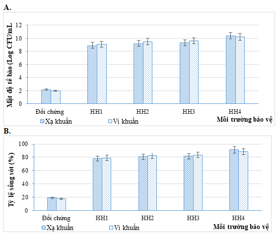 Hai chủng TA3.A03 và ĐL01.B09 được thử nghiệm bảo quản với 4 công thức môi trường thử nghiệm trên thiết bị đông khô chuyên dụng của đơn vị (áp dụng bước tiền xử lý lạnh sâu ở -80°C). Kết quả trên Hình 3.A và 3.B chỉ ra cả 4 công thức môi trường bảo vệ sử dụng đều cho hiệu quả bảo vệ cao, thể hiện ở tỉ lệ sống sót của cả 2 chủng giống sau 24 giờ xử lý đông khô đạt từ 78 - 91%, cao hơn gấp khoảng 4 lần so với mẫu đối chứng chỉ đạt 18% - 19%. Trong đó, công thức môi trường bảo vệ HH4 gồm các thành phần: Trehalose 10% + skim milk 10% + natri glutamat 1% + NaCl 0.9% cho hiệu quả bảo vệ cao nhất, thể hiện ở tỉ lệ sống sót đạt 91% đối với mẫu xạ khuẩn và 88% đối với mẫu vi khuẩn, giá trị Log(CFU/mL) đạt 10,4 và 10,2, tương ứng mật độ tế bào đạt 4,9×1010 CFU/mL và 2,6×1010 CFU/mL. Điều này cho thấy, việc sử dụng kết hợp bổ sung đồng thời các chất bảo vệ là trehalose và skim milk cùng với NaCl 0,9% và natri glutamat 1% có tác dụng nâng cao tỉ lệ sống sót của hai chủng nghiên cứu sau đông khô tốt hơn so với các mẫu được xử lý với HH1, HH2, HH3 và so với mẫu được xử lý với các chất đơn lẻ (Hình 2.A và Hình 2.B). Kết quả nghiên cứu của chúng tôi cũng phù hợp với một số nghiên cứu đã chỉ ra, môi trường bảo vệ có sự kết hợp đồng thời của một số chất bảo vệ cho tỷ lệ sống sót cao hơn khi sử dụng môi trường chỉ chứa riêng lẻ một chất trong quá trình bảo quản đông khô [1, 3, 11]. Việc sử dụng 10% trehalose làm chất bảo vệ giúp duy trì khả năng sống sót đạt 74%, trong khi đó sự kết hợp của trehalose với skim milk và natri glutamat làm tăng khả năng sống sót của chủng vi khuẩn lên 85% sau khi đông khô cũng được công bố [2]. Trong nghiên cứu này, việc kết hợp của trehalose với skim milk và natri glutamat (HH3) cũng cho hiệu quả đông khô cao, thể hiện ở tỷ lệ sống sót sau 24 giờ đông khô các chủng xạ khuẩn đạt 81%, các chủng vi khuẩn đạt 83%. Tuy nhiên, các chủng vi sinh vật nghiên cứu có nguồn gốc phân lập từ môi trường biển nên việc bổ sung thêm một tỷ lệ NaCl 0,9% (ở HH4) có tác dụng nâng cao hiệu quả của bảo quản đông khô đối với các chủng giống này hơn so với khi xử lý với HH3 (Hình 3.A và Hình 3.B).