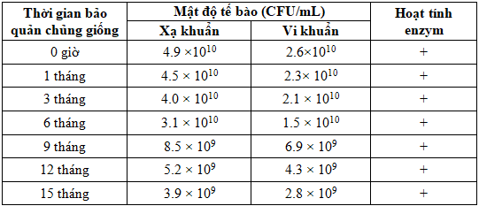 Bảng 1. Chất lượng bảo quản chủng giống xạ khuẩn và vi khuẩn theo thời gian