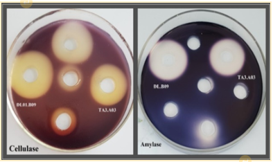 Hình 4. Hoạt tính enzym cellulase và amylase của hai chủng vi khuẩn và xạ khuẩn sau đông khô