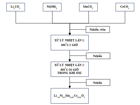 Vật liệu Li1,0Ni0,9Mn0,05Co0,05O2 được điều chế theo phương pháp phản ứng pha rắn (sau đây được ký hiệu là NMC9.5.5-PR). Các tiền chất sử dụng là muối liti cacbonat, niken hydroxit, mangan cacbonat, coban cacbonat. Khối lượng các chất được sử dụng sao cho tỉ lệ mol giữa các nguyên tử Li:Ni:Mn:Co = 1:0,9:0,05:0,05 để tạo thành vật liệu cấu trúc lớp với công thức phân tử Li1,0Ni0,9Mn0,05Co0,05O2. Khối lượng muối Li2CO3 được lấy dư 5% so với lượng cần thiết để bù cho lượng ion liti bị bay hơi trong quá trình phân hủy nhiệt. Sơ đồ tiến hành thí nghiệm được trình bày trong Hình 1, cụ thể như sau: