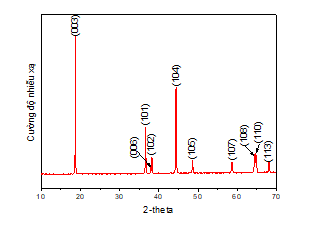 Cấu trúc tinh thể của vật liệu NMC9.5.5 được thể hiện trong Hình 2. Các đỉnh nhiễu xạ của vật liệu xuất hiện tại góc 2θ lần lượt 18,7; 36,6; 38; 38,3; 44,4; 48,6; 58,6; 64,4; 64,7 và 68,0o tương ứng với các mặt mạng (003), (101), (006), (102), (104), (105), (107), (108), (110) và (113). Các peak nhiễu xạ này đều hoàn toàn trùng khớp với thẻ phổ PDF 04-013-4379 với cấu trúc mặt thoi - ba phương, tương ứng với nhóm không gian , cũng như phổ XRD của vật liệu NMC khác trong các báo cáo trước đây [7]. Các đỉnh nhiễu xạ trong phổ XRD đều rõ ràng và sắc nét, sự phân tách rõ giữa 2 đỉnh peak của mặt tinh thể (108) và (110) và không xuất hiện các pic lạ chứng tỏ vật liệu tổng hợp được có độ kết tinh cao.