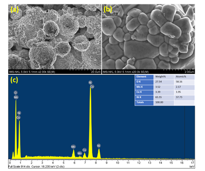 Thành phần nguyên tử trong vật liệu NMC được xác nhận thông qua phương pháp phổ tán xạ năng lượng tia X (EDX) và kết quả được thể hiện trong Hình 3c. Hình 3c cho thấy, sự xuất hiện các nguyên tố Ni, Mn, Co và O trong vật liệu NMC9.5.5-PR; nguyên tố Li không xuất hiện là do bản chất phép đo EDX không xác định được nguyên tố có khối lượng phân tử nhỏ như Li. Tỷ lệ Ni/Mn/Co của vật liệu NMC tương ứng là 9,67/0,56/0,50; kết quả này tương đối phù hợp với tỷ lệ nguyên tử của Ni2+/Mn2+/Co2+ trong hỗn hợp muối ban đầu. Tỉ lệ này không hoàn toàn trùng với tỉ lệ ban đầu là 9,0/0,5/0,5 xuất phát chủ yếu từ sai số của phép đo EDX.