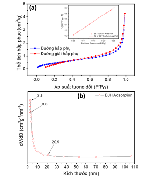 Hình 4. (a) Đường hấp phụ đẳng nhiệt; (b) Phân bố kích thước lỗ xốp của vật liệu NMC9.5.5-PR