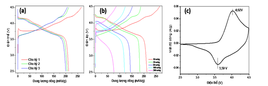 Phương pháp nạp xả dòng không đổi (GCD) và phổ tổng trở điện hóa (EIS) được sử dụng để đánh giá hiệu suất điện hóa của vật liệu chế tạo được. Hình 5a là đường nạp xả trong 3 chu kỳ đầu tiên tại mật độ dòng 10 mA/g. Dung lượng riêng nạp/xả của 3 chu kỳ đầu tiên lần lượt là 265,5/212,4; 212,7/206,1; 207,3/200,4 mAh/g. Tại chu kỳ đầu tiên, hiệu suất culong của vật liệu chỉ đạt 80%; chỉ ra rằng, quá trình trao đổi ion liti ở chu kỳ đầu tiên không thuận nghịch. Cụ thể, một lượng lớn ion liti từ cực dương sang cực âm trong qua trình nạp nhưng không trở về được hoàn toàn trong quá trình xả. Tuy nhiên, hiệu suất culong đã tăng nhanh chóng lên 96,89% ở chu kỳ thứ 2; 98,60% ở chu kỳ thứ 3. Kết quả này gợi ý rằng, vật liệu NMC9.5.5-PR nhanh chóng đạt cấu trúc ổn định sau chu kỳ đầu tiên. Dung lượng riêng của vật liệu NMC9.5.5-PR là vượt trội hơn hoặc tương đương so với các nghiên cứu trước đây về vật liệu NMC như vật liệu NMC9.5.5 đạt dung lượng riêng 225 mAh/g tại 0,1C [10], vật liệu NMC811 đạt dung lượng 200 mAh/g [11] tại mật độ dòng 0,25 C, NMC622 đạt dung lượng 198 mAh/g [12].