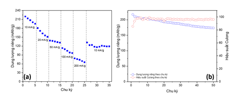 Hình 6. Hiệu suất chu kỳ của vật liệu NMC9.5.5-PR: (a) tại mật độ dòng khác nhau, (b) tại mật độ dòng 10 mA/g.