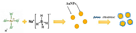 Lấy 20 mL PDADMAC 0,008 ppm và 500 µL HAuCl4.3H2O 10 mM vào cốc chịu nhiệt 100 ml. Khuấy mạnh bằng thiết bị khuấy từ trong khoảng 5 phút. Thêm 600 μL NaBH4 0,05M, tiếp tục khuấy dung dịch trong khoảng 15 phút đến khi dung dịch chuyển sang màu đỏ rượu biểu thị sự hình thành các hạt AuNPs. Dung dịch sau đó được làm mát đến nhiệt độ phòng và bảo quản ở 4°C trong tủ lạnh.