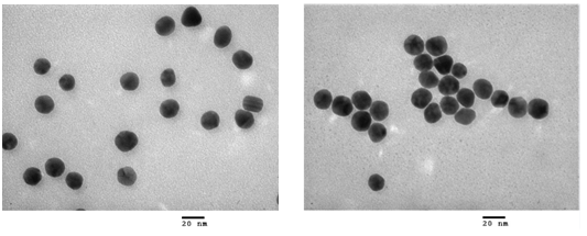 Hình 3. Hình thái của các hạt nano vàng khi được ổn định bằng PDADMAC (trái) và khi có mặt acetamiprid (phải)
