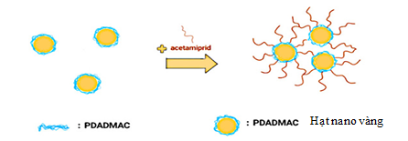 Khi acetamiprid có mặt trong dung dịch AuNPs-PDADMAC, acetamiprid có khả năng hấp phụ rất tốt trên các hạt AuNPs do trong phân tử có chứa nhóm -NH có ái lực cao với vàng. Khi đó, các hạt PDADMAC-AuNPs kết tụ lại với nhau thông qua tương tác kị nước giữa các phân tử acetamiprid (Hình 4) và làm cho dung dịch chuyển từ màu đỏ rượu sang màu tím. Đồng thời, bước sóng hấp thụ cực đại của dung dịch có chất phân tích acetamiprid cũng tăng lên đáng kể so với dung dịch không có acetamiprid [11].