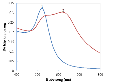 Hình 5. Phổ hấp thụ của dung dịch AuNPs-PDADMAC khi chưa có mặt của acetamiprid (đường 1) và khi có mặt của acetamiprid (nồng độ 10-6 M) (đường 2)