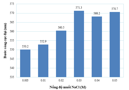 Khi tăng nồng độ muối NaCl từ 0,005 M đến 0,05 M, bước sóng cực đại có xu hướng tăng cho thấy khả năng co cụm của các hạt nano vàng tăng khi tăng cường độ lực ion của dung dịch và đạt bão hòa khi nồng độ NaCl tại 0,03 M và sau đó giảm nhẹ. Tuy nhiên, tại nồng độ 0,03M, dung dịch AuNPs- PDADMAC bắt đầu bị đổi màu rõ rệt ngay cả khi chưa có chất phân tích, gây ảnh hưởng đến quá trình quan sát sự thay đổi của dung dịch khi thêm chất phân tích. Do đó, nồng độ 0,02 M được chọn là điều kiện tối ưu cho các thí nghiệm tiếp theo.