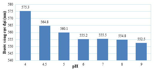 Tại pH 4 bước sóng cực đại là lớn nhất, sau đó giảm mạnh khi tăng pH đến 9. Tuy nhiên, tại pH 4 và 4,5 dung dịch AuNPs-PDADMAC bắt đầu bị đổi màu rõ rệt ngay cả khi chưa có chất phân tích, do đó, pH 5 được chọn là điều kiện tối ưu cho các thí nghiệm tiếp theo.