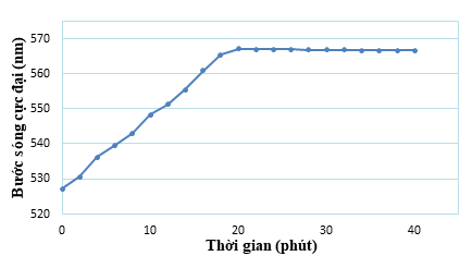 Thời gian phản ứng là một yếu tố quan trọng trong việc xác định mức độ co cụm của các hạt nano vàng. Khảo sát ảnh hưởng của thời gian bằng cách ghi lại bước sóng cực đại của dung dịch AuNPs-PDADMAC chứa acetamiprid nồng độ 8×10-7 M, nồng độ NaCl 0,02 M, pH 5, trong thời gian 40 phút, kết quả được thể hiện trong Hình 8.