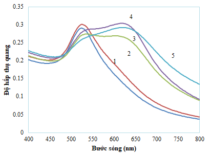 Hình 9. Phổ hấp thụ quang của dung dịch AuNPs-PDADMAC với các nồng độ acetamiprid khác nhau (Đường từ 1 đến 5 tương ứng là 10-7 M, 2×10-7 M, 4×10-7 M, 6×10-7 M, 2×10-6 M)