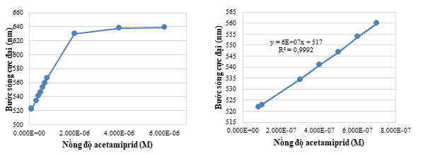 Khi tăng nồng độ acetamiprid, có sự dịch chuyển bước sóng cực đại sang bước sóng dài hơn (red-shift). Khi xây dựng mối quan hệ giữa bước sóng cực đại và nồng độ acetamiprid thu được mối quan hệ tuyến tính trong khoảng nồng độ khảo sát. Đây cũng chính là cơ sở để định lượng acetamiprid bằng dung dịch AuNPs-PDADMAC.