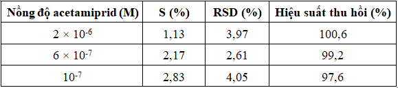 Độ đúng và độ lặp lại của phương pháp được đánh giá thông qua sai số trung bình (S%), độ lệch chuẩn tương đối (% RSD), hiệu suất thu hồi (%) khi tiến hành đo lặp lại 10 lần các dung dịch AuNPs-PDADMAC chứa acetamiprid ở 3 mức nồng độ là 2×10-6 M, 6×10-7 M và 10-7 M. Kết quả đo được (Bảng 1) cho thấy giá trị độ lệch chuẩn tương đối (RSD) đều dưới 5% đáp ứng yêu cầu AOAC (Association of Official Analytical Chemists - Hiệp hội các nhà hóa học phân tích chính thống) và hiệu suất thu hồi đạt từ 97,6% đến 100,6%: